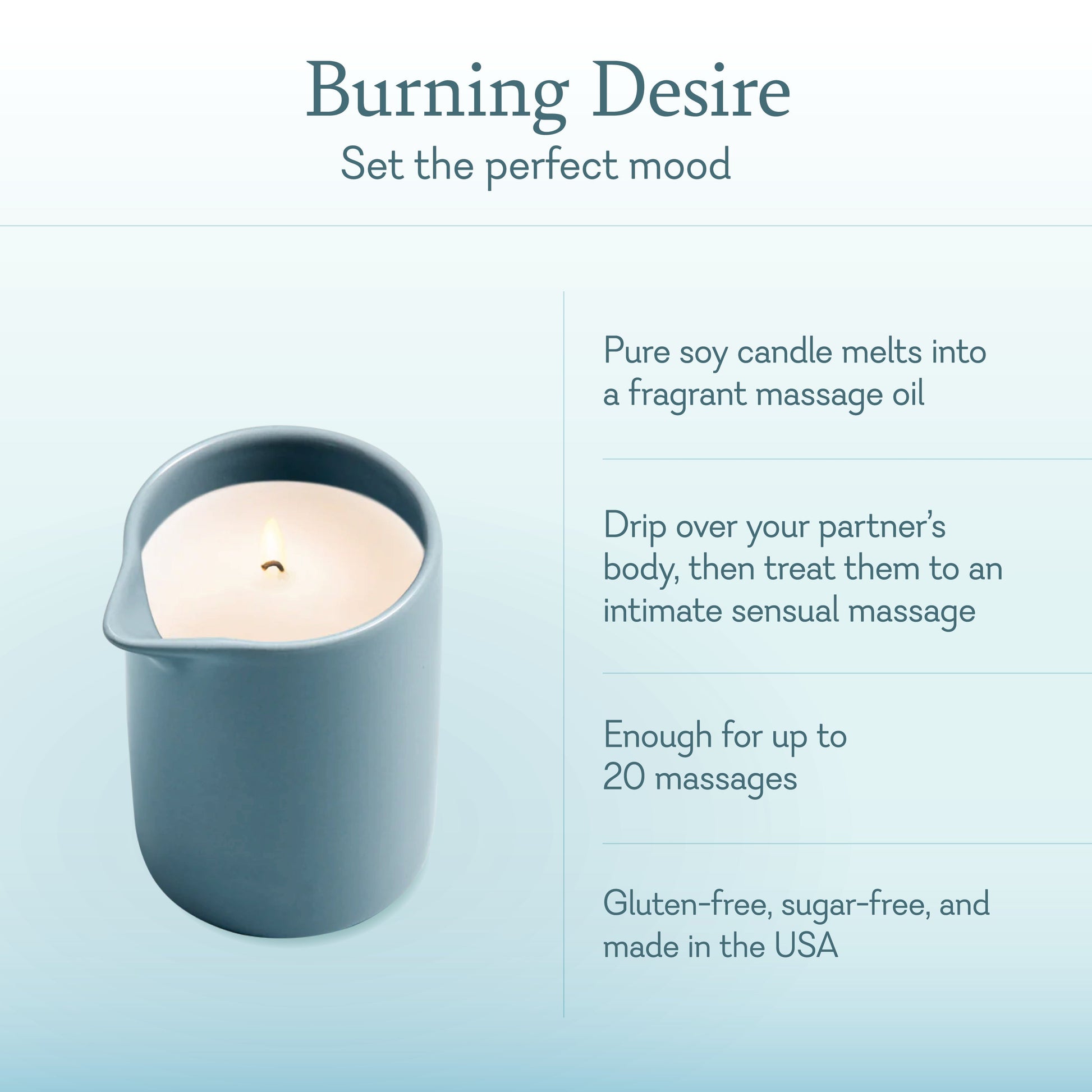 Ignite a flame with Burning Desire! Burn this soy massage oil candle and let the sweet, fragrant oil take over your body. Melted massage oil is great for doubling as a warm, rich body balm. Lasts up to 20 massages.
