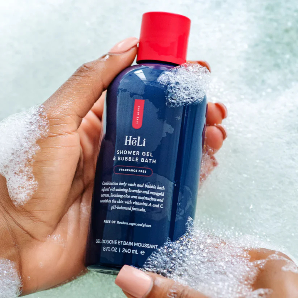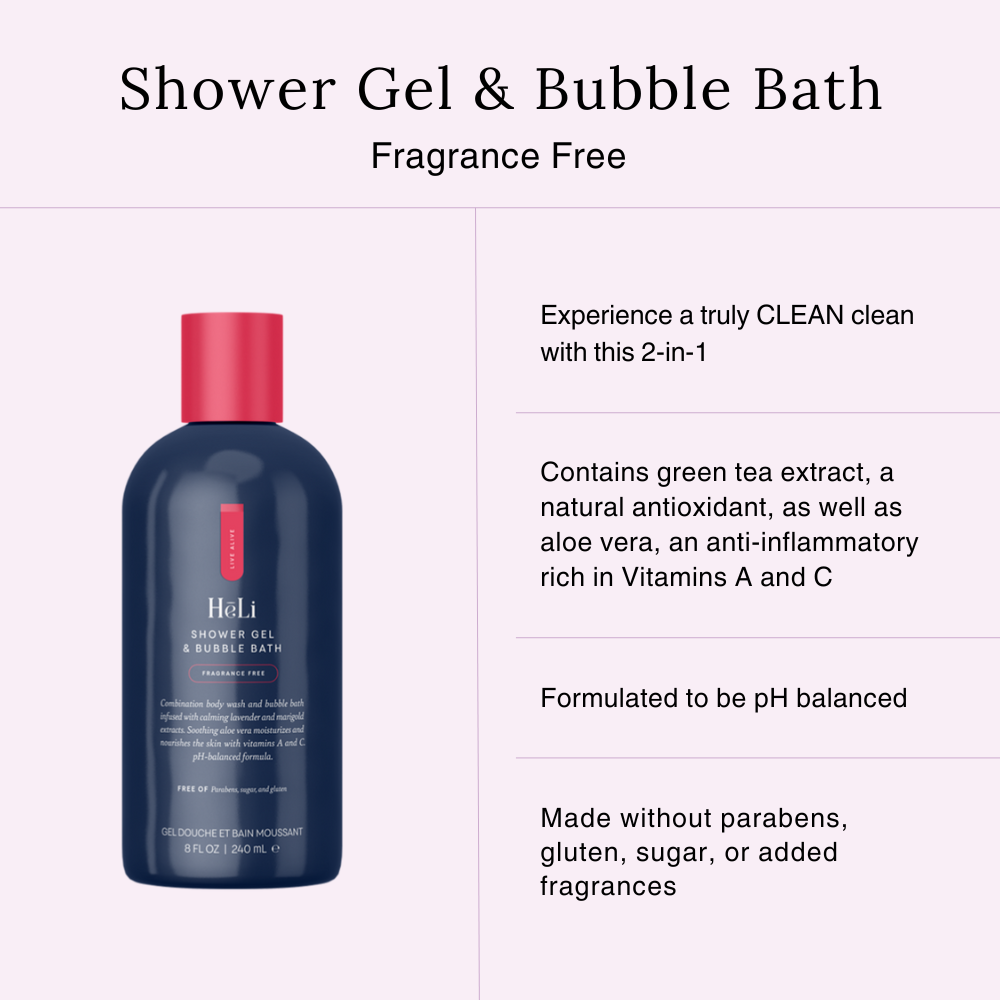 Shower your skin with the cleansing botanicals of HeLi Shower Gel & Bubble Bath! This get-clean essential is pH-balanced and infused with lavender and marigold extracts, botanicals known to calm skin and help reduce redness. This plant-inspired 2-in-1 is also made with rejuvenating green tea extract, a natural antioxidant, as well as aloe vera, an anti-inflammatory rich in Vitamins A and C.