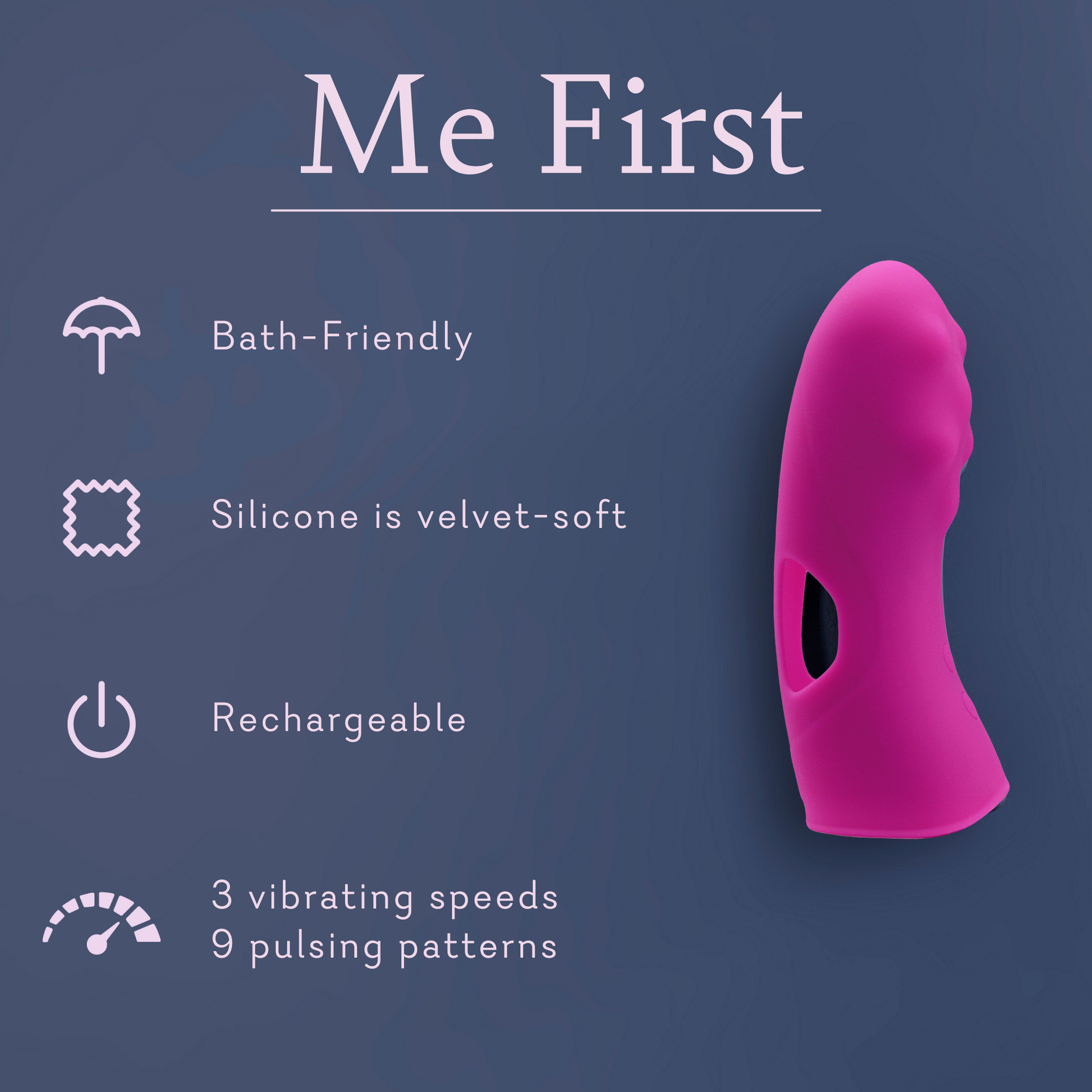 Put your pleasure center stage with Me First, a clitoral vibrator designed to fit perfectly over your finger. Tantalizing textures and vibrations make this powerful vibe perfect for teasing the clitoris, g-spot, and any place desired on your favorite body, yours or your partner's. Tonight, your ecstasy comes first.