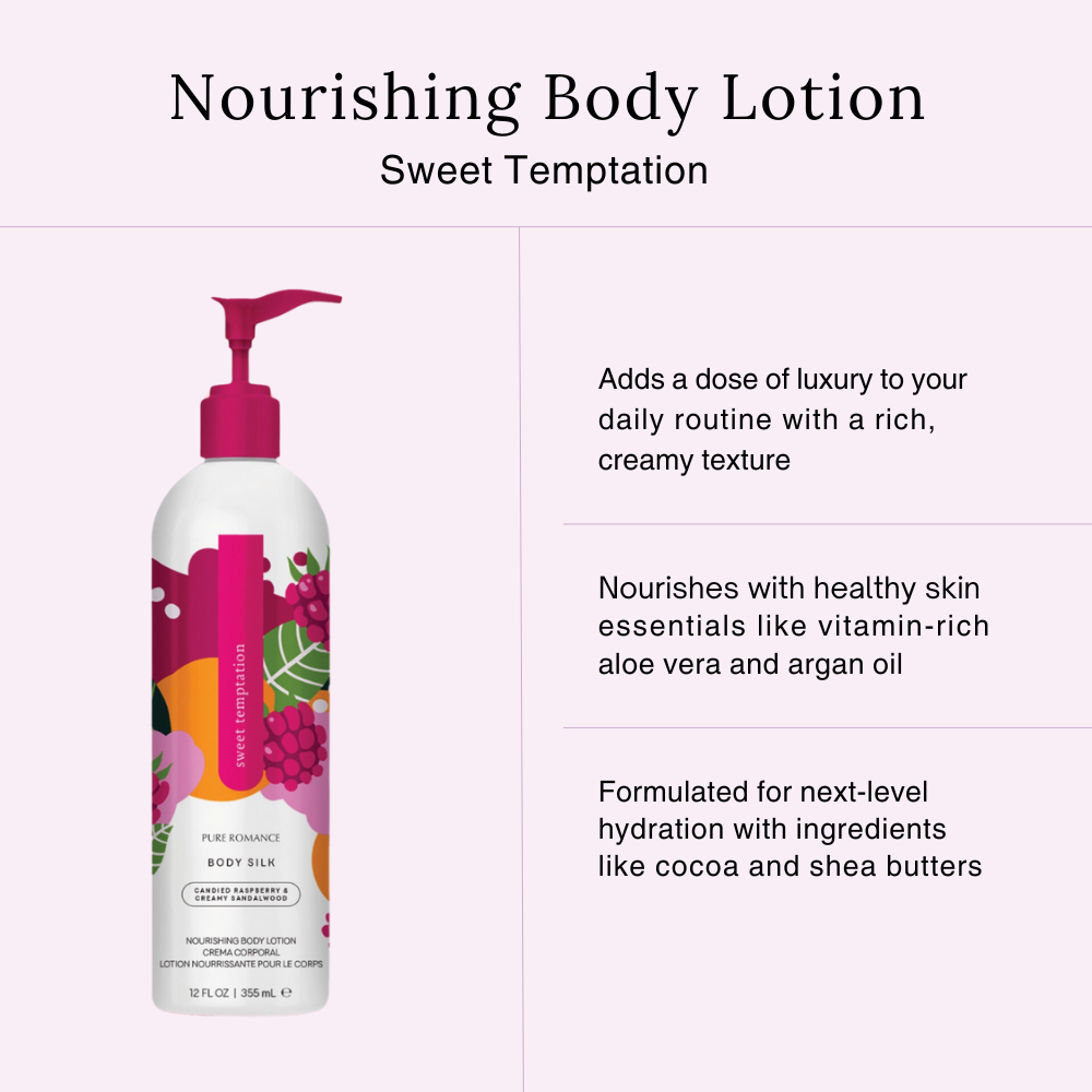 Care for your skin every day with Nourishing Body Lotion. This all-over body cream is specially formulated with argan oil, aloe vera, and shea butter for next-level hydration. The lotion’s special ingredient, argan oil, is naturally rich in fatty acids and vitamin E—both essential for skin that looks and feels smooth and healthy. Apply all over every morning or night to give your skin a dose of moisture. Sweet Temptation is a delectable mix of candied raspberries, creamy sandalwood, and sweet mandarin.