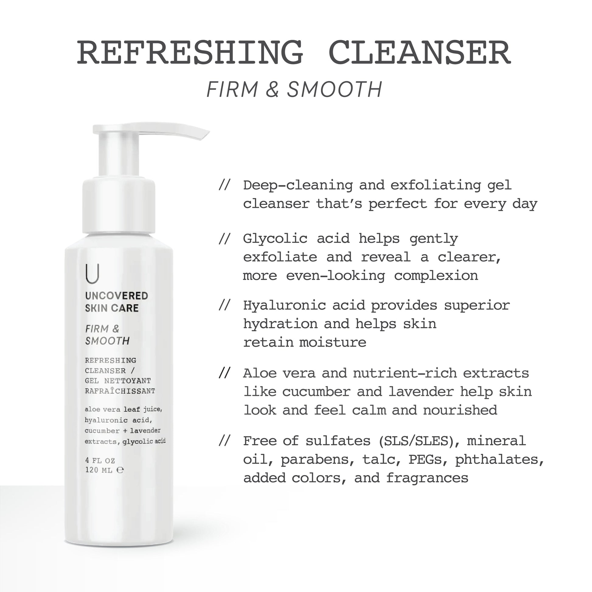 Experience a gentle, powerful clean with our Refreshing Cleanser. Glycolic acid helps exfoliate and reveal a clearer, more even looking complexion, while hyaluronic acid penetrates to help moisturize and make skin feel firm. Dispense one pump, massage over your wet face and neck, and then rinse as part of your daily skin routine.